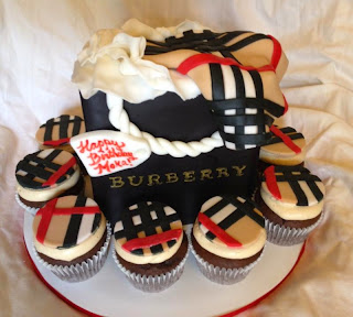 Burberry shopping tote with their signature plaid. Cupcake and cakes are chocolate cake with peanut butter frosting.
